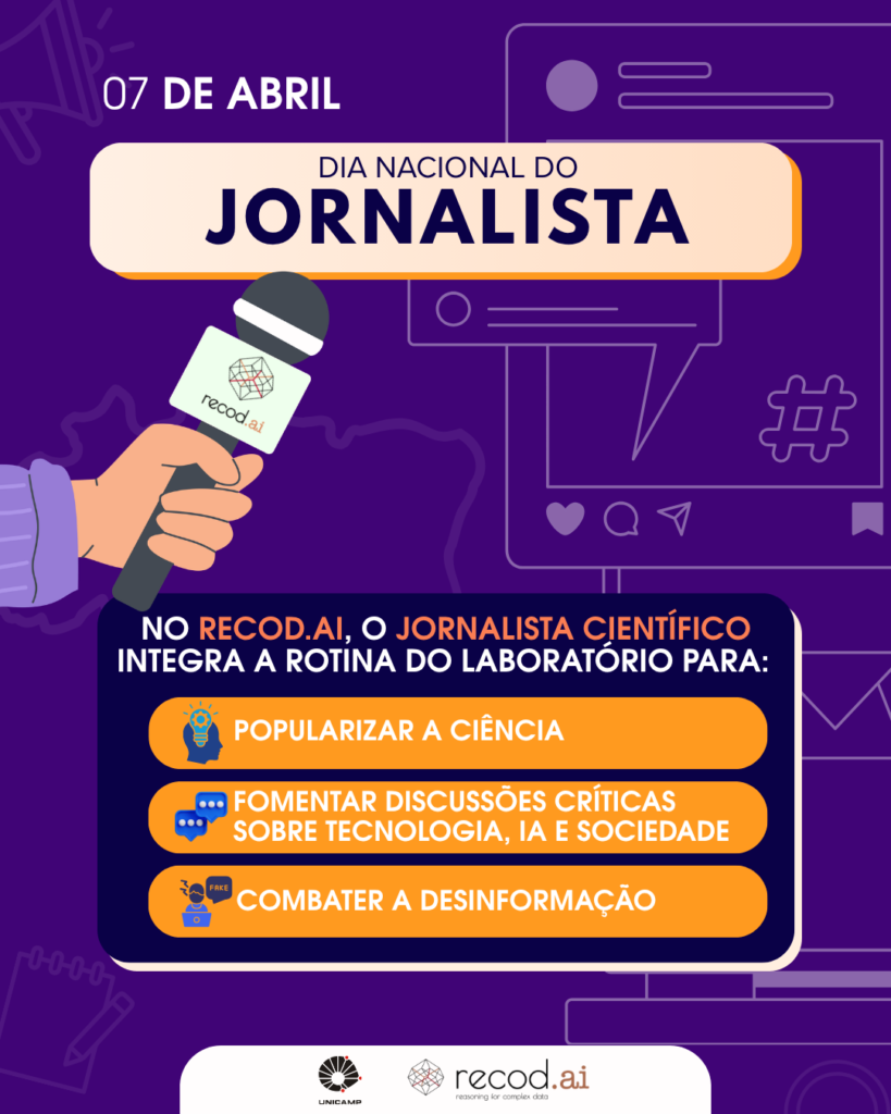 Neste Dia do Jornalista, celebramos quem estuda, investiga, interpreta e contextualiza dados para levar a ciência de uma forma mais segura e atrativa até você. Resultado disso, é a forte confiança que a imprensa brasileira deposita no Recod.ai atualmente. Nossos pesquisadores são frequentemente procurados por veículos de jornalismo para explicar conceitos relacionados à IA e esclarecer dúvidas do público.